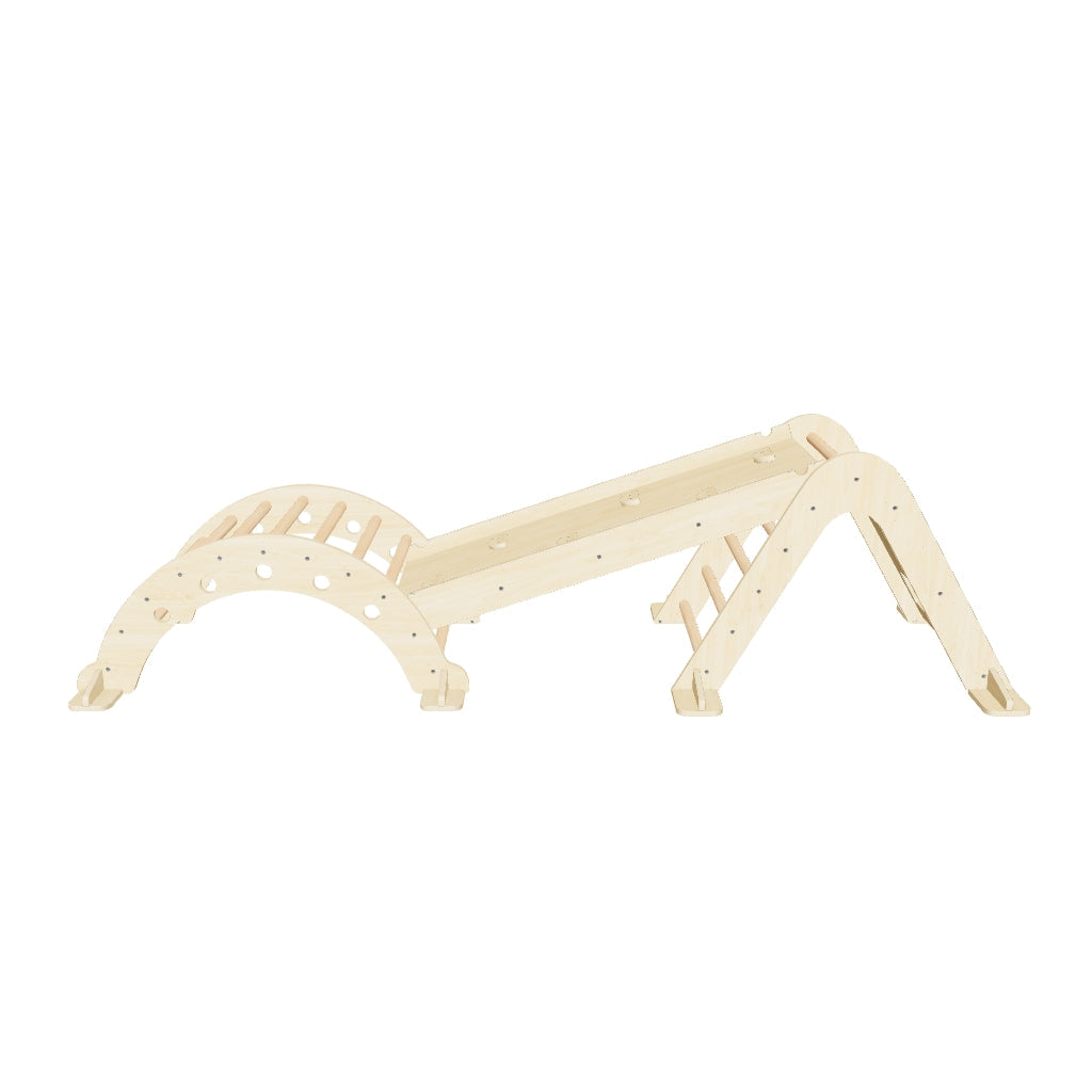 - 3-PIECE PLAY STRUCTURE -- This wooden toddler climber has a triangle, ramp and arch. The triangle and ramp have 2 climbable sides. And the arch doubles as a rocker.