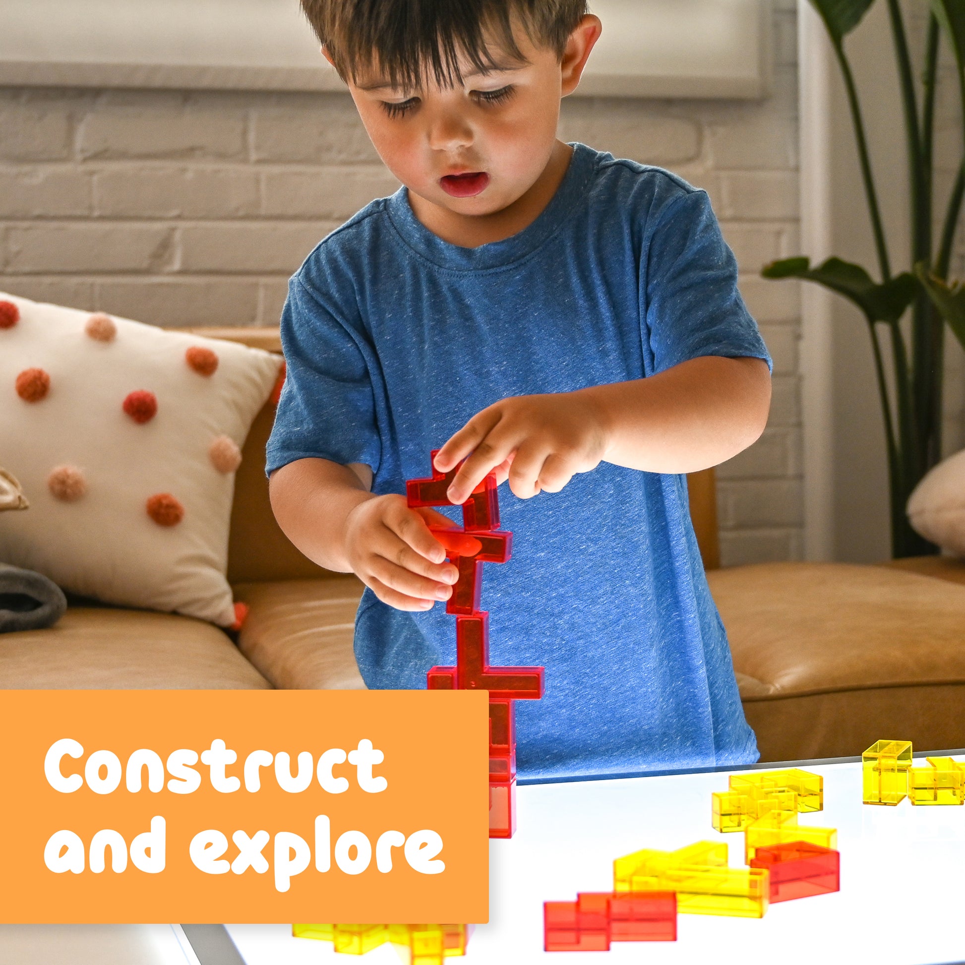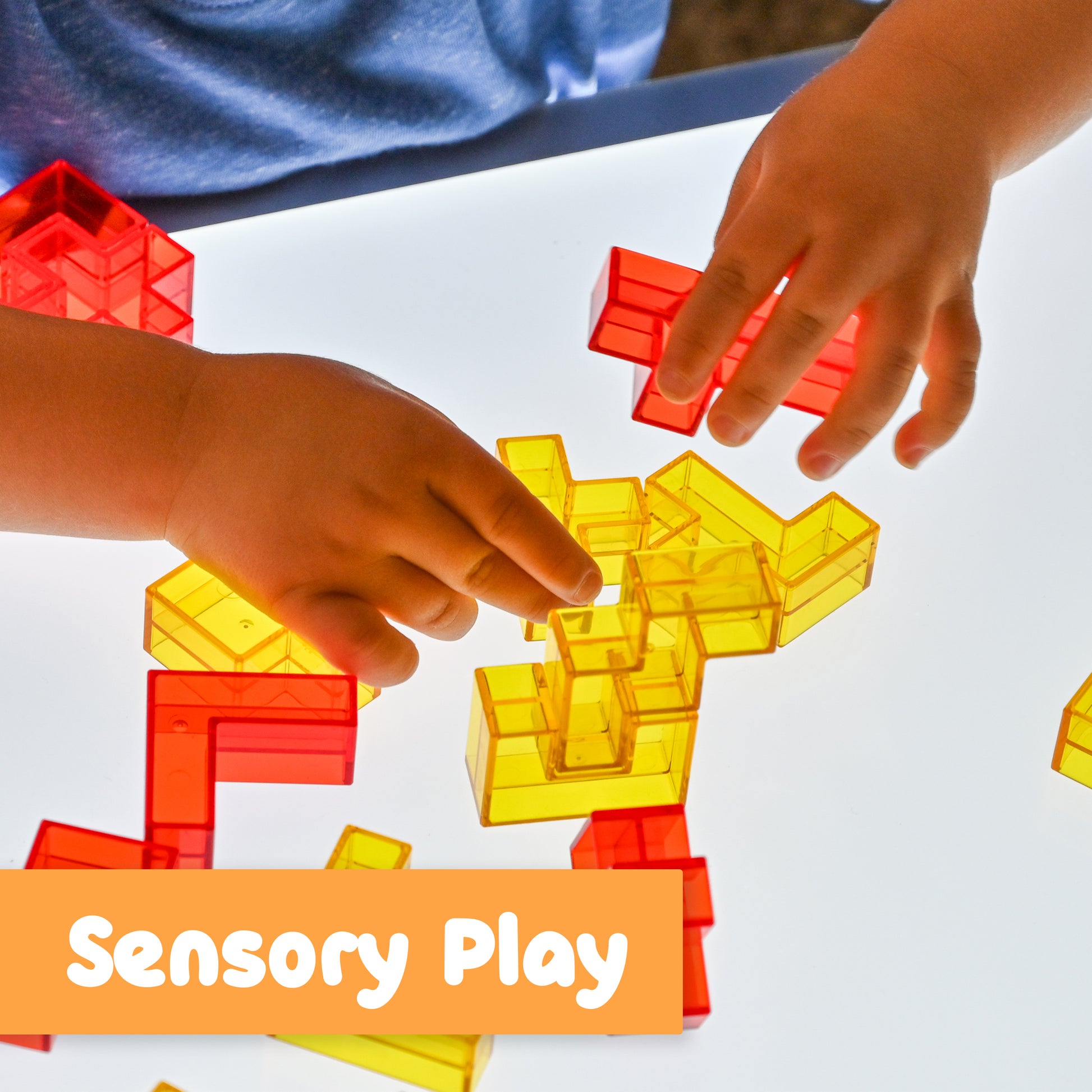 - SENSORY PLAY -- Use these chunky blocks to build up and out. Create translucent, sensory structures and designs. Or, sort and match the two colors and 12 shapes.