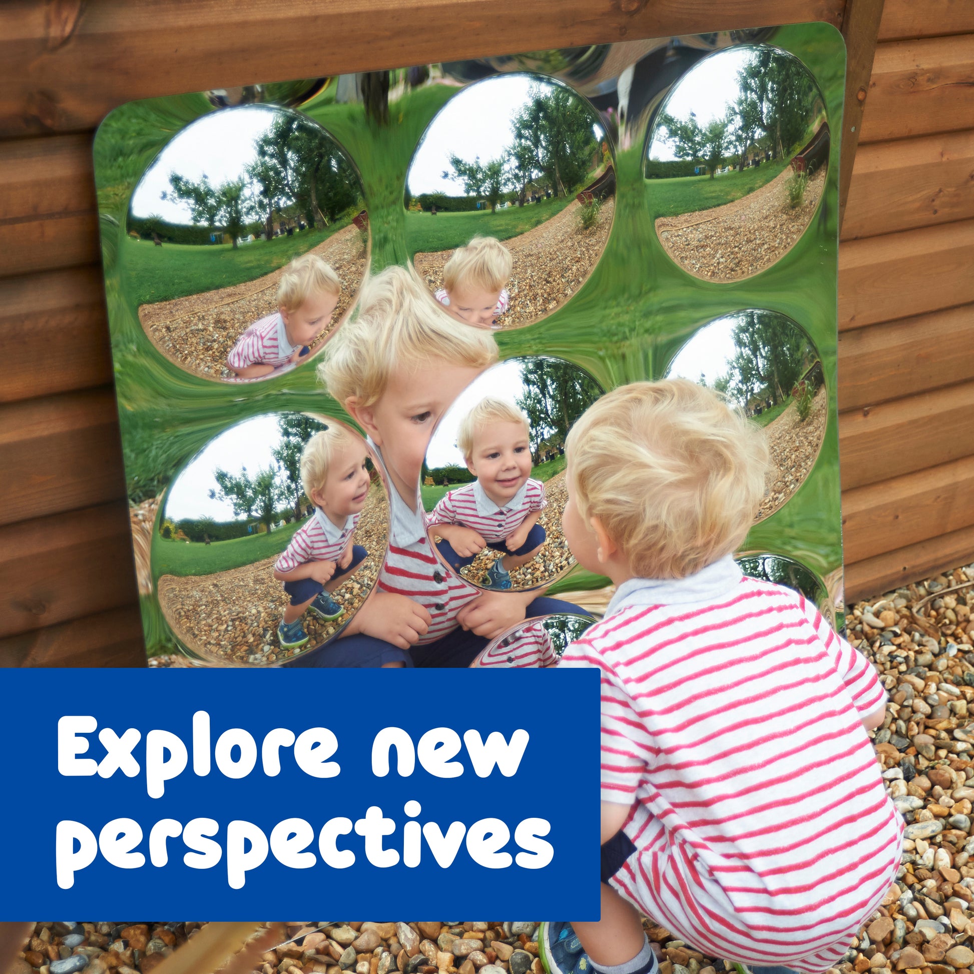 - 9 BUBBLES -- This sensory wall mirror features 9 convex domes for sensory observation. Provide an amusing, distorted view of the world for children to explore.