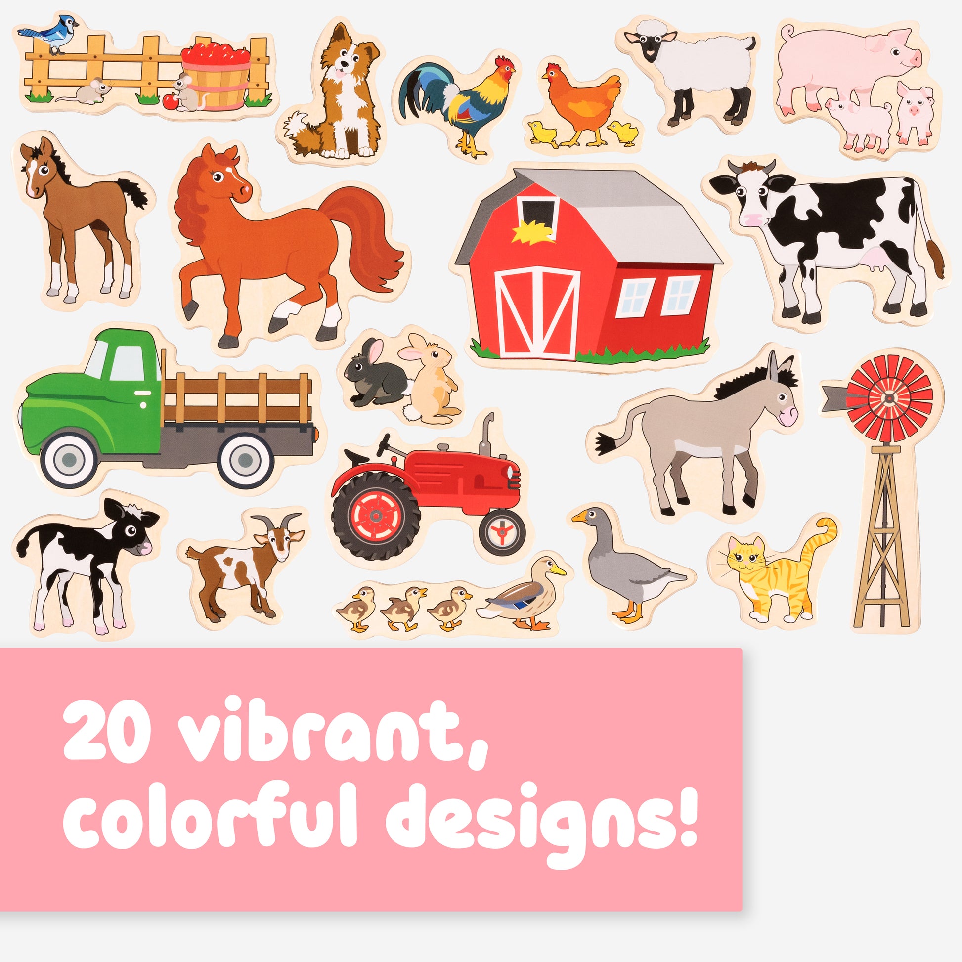 - 20 DIFFERENT FARM SHAPES -- This wooden magnet set features 20 colorful farm magnets in 20 different shapes. Decorate and play with a barn, tractor, horse, truck and more!
