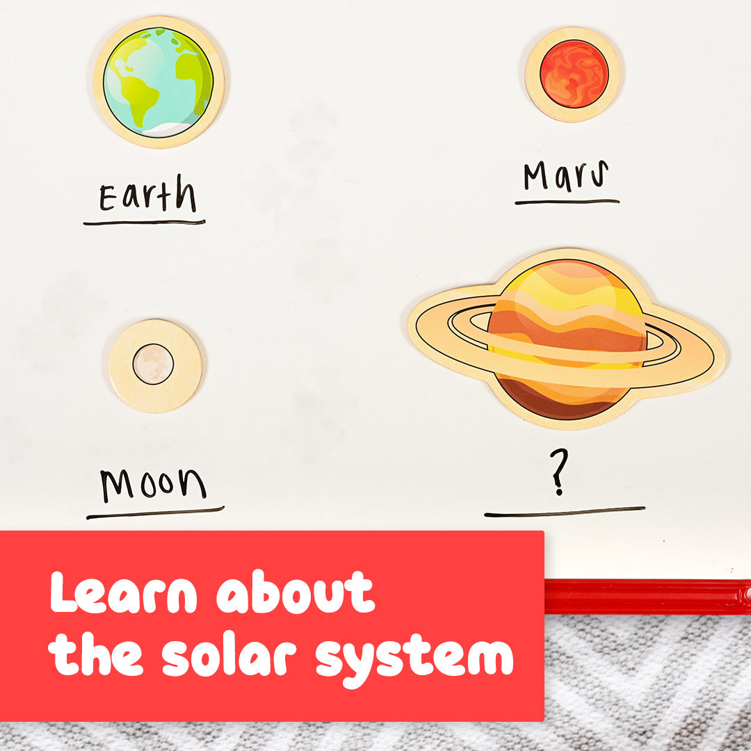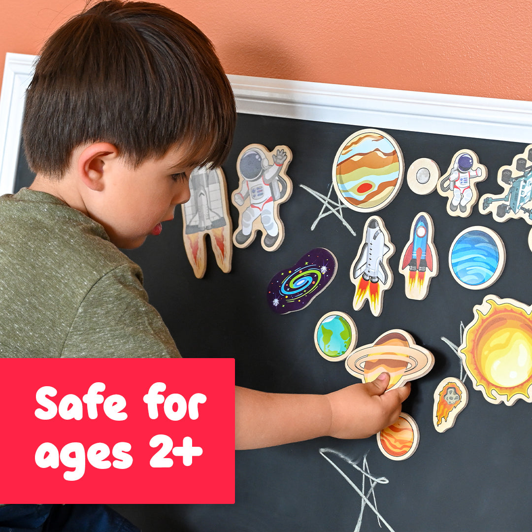 - 20 DIFFERENT SPACE SHAPES -- This wooden magnet set features 20 colorful magnets in different space-themed shapes. Decorate and play with rockets, planets, astronauts and more!