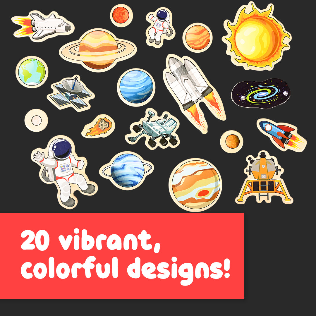 - ARRANGE OUTER SPACE SCENES -- Create galactic scenes with cute designs, vibrant colors and various sizes. Decorate fridges, whiteboards, appliances and more!